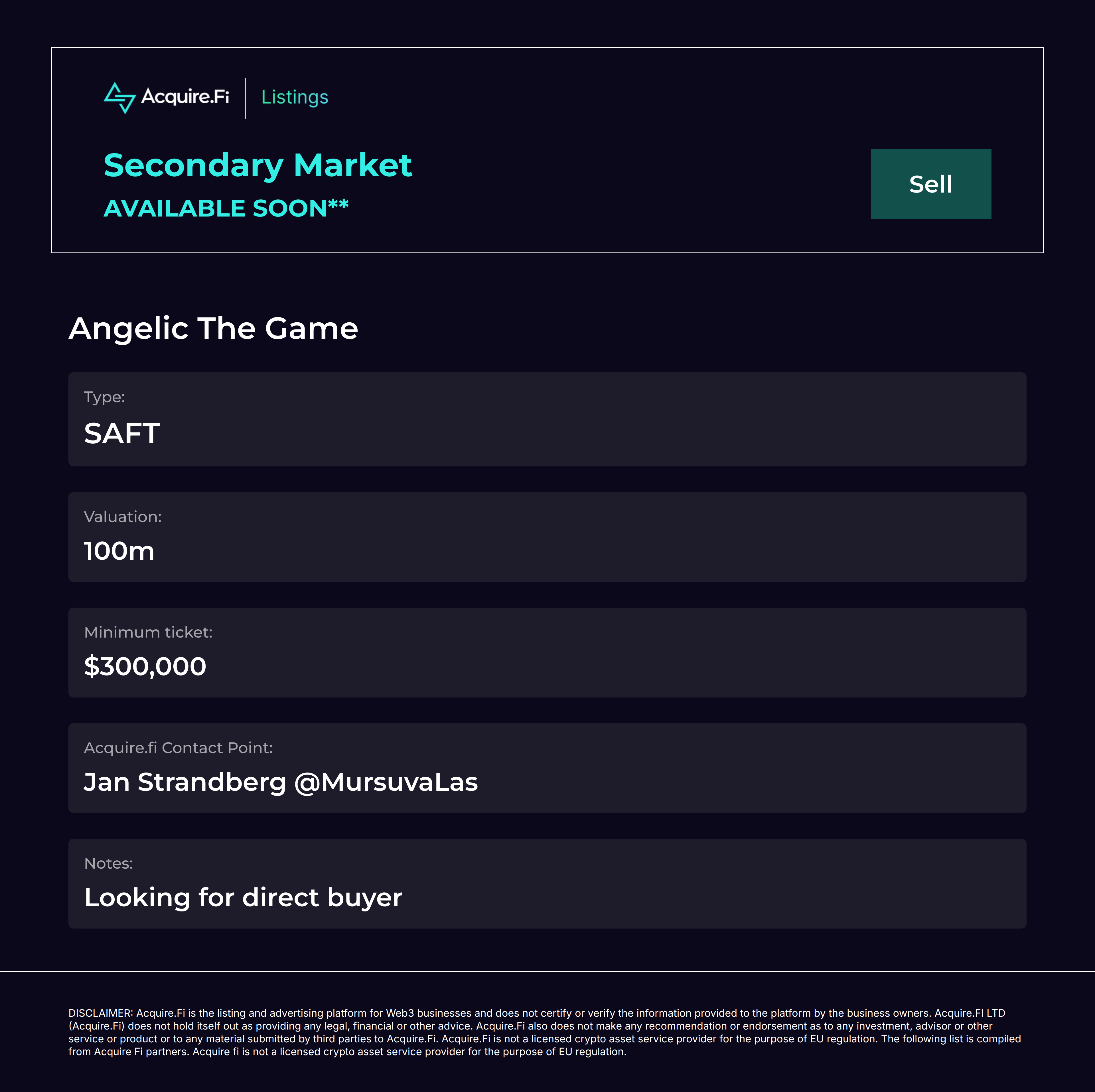 Secondary Market Sell: Angelic The Game
